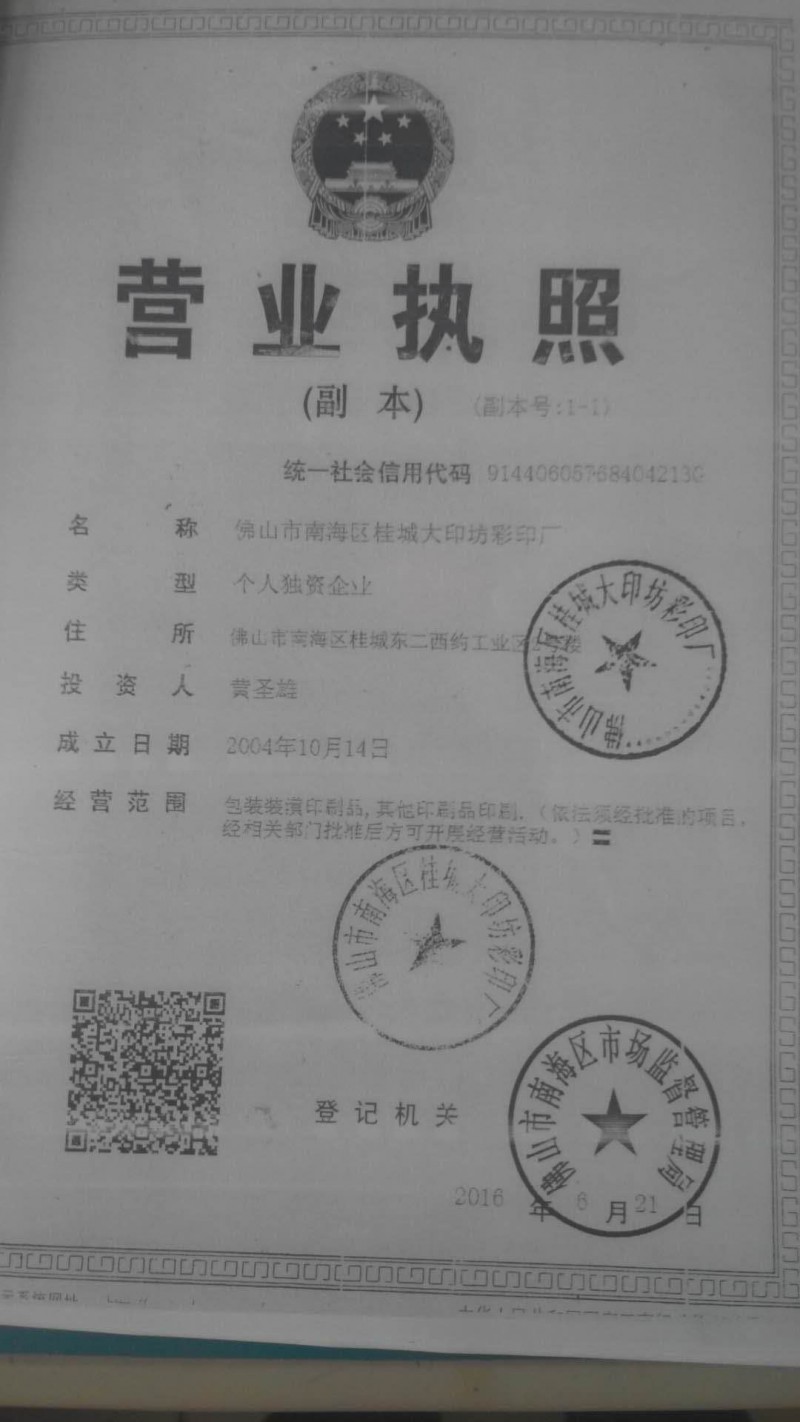 佛山市南海區桂城大印坊彩印廠營業執照