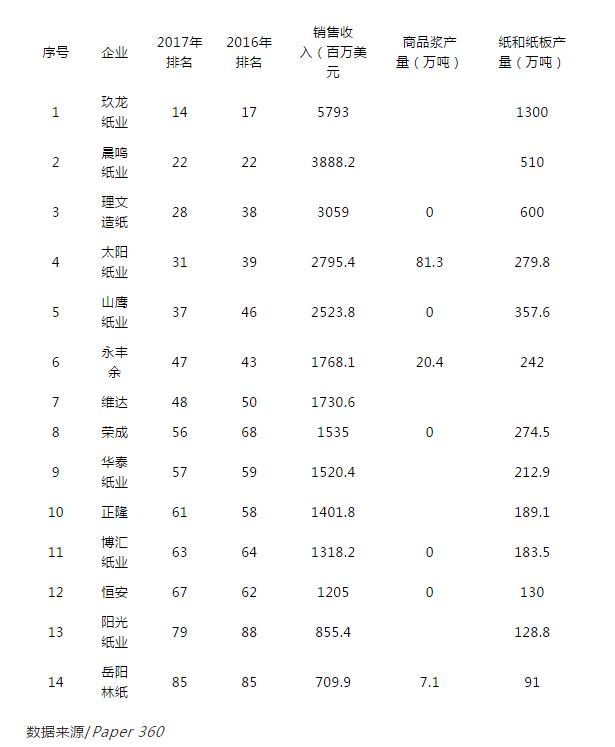 小編整理榜單發現,共有14家中國企業進入全球100強,其中9家企業的排名都比前一年有所提高。玖龍紙業排名中國企業第一,2017年營業收入達到5793百萬美元,晨鳴紙業、理文造紙、太陽紙業和山鷹紙業位列第二到第五位。