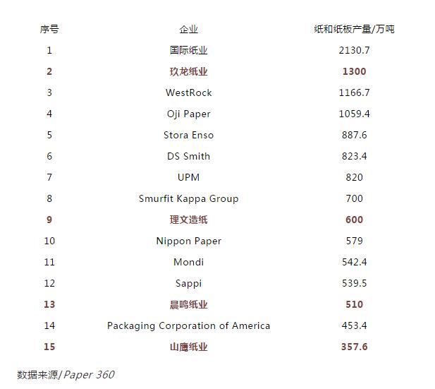 美國paper360雜志根據2017年(部分企業為財年)企業營業收入為依據,公布了最新的全球紙業100強名單,美國的三家企業國際紙業、P&G和WestRock位列前三,日本的Oji,芬蘭的UPM緊隨其后。