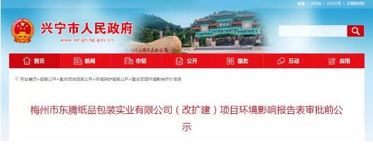 廣東省梅州市興寧市人民政府于12月24日發(fā)布了東騰紙品包裝實業(yè)有限公司項目環(huán)境影響報告表,現(xiàn)已進入審批前公示。該項目投資1.1元,可年產(chǎn)瓦楞紙板7000萬平方米、紙箱1500萬套。