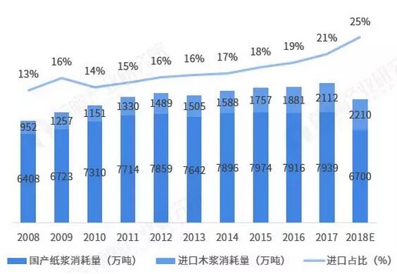 圖表12:2008-2018年中國國產及進口紙漿消耗量及預測值(單位:萬噸,%)