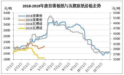 結合2018年廢黃板紙和瓦楞原紙的價格走勢看,在上半年兩者的走勢基本一致。但進入2019年后,兩者的走勢已出現了一定的背離,其背離主要有三個方面的特征: