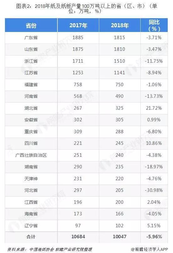 而在省份格局上,廣東、山東以及浙江為主要產(chǎn)區(qū)。2018年廣東、山東、浙江、江蘇、福建、河南、湖北、安徽、重慶、四川、廣西、湖南、天津、河北、江西、海南和遼寧17個?。▍^(qū)、市)紙及紙板產(chǎn)量超過100萬噸,產(chǎn)量合計10047萬噸,占全國紙及紙板總產(chǎn)量的96.28%。