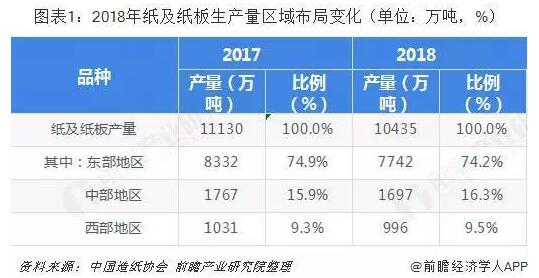 根據(jù)中國造紙協(xié)會調(diào)查資料,2018年我國東部地區(qū)11個?。▍^(qū)、市),紙及紙板產(chǎn)量占全國紙及紙板產(chǎn)量比例為74.2%;中部地區(qū)8個省(區(qū))比例占16.3%;西部地區(qū)12個?。▍^(qū)、市)比例占9.5%。
