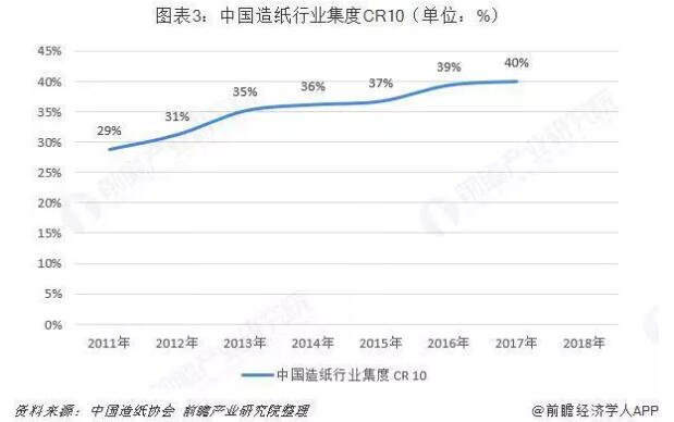 從行業(yè)整體的產(chǎn)銷量數(shù)據(jù)來看,經(jīng)過2010年以來的環(huán)保政策去產(chǎn)能之后,造紙行業(yè)的CR10從2011年的28.70%逐步上升到2017年的39.95%,而美國造紙行業(yè)在經(jīng)歷環(huán)保立法去產(chǎn)能及行業(yè)并購之后,CR10已經(jīng)達到了90%左右。