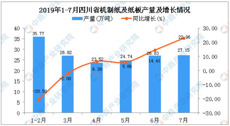 據(jù)中商產(chǎn)業(yè)研究院數(shù)據(jù)庫顯示,2019年1-2季度四川省機制紙及紙板產(chǎn)量有所增長,增長19.97%。2019年7月四川省機制紙及紙板產(chǎn)量為27.15萬噸,同比增長22.96%。2019年1-7月四川省機制紙及紙板產(chǎn)量為188.15萬噸,同比增長15.12%。