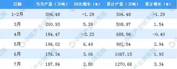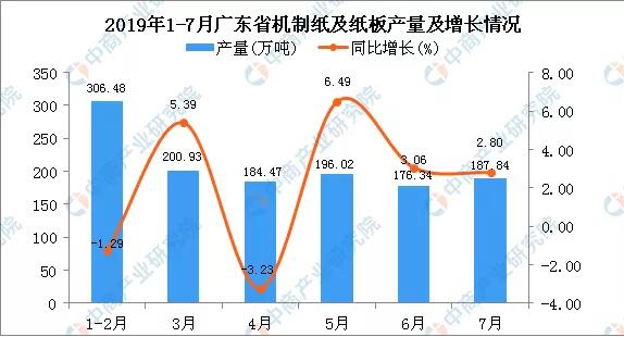 2019年1-2季度廣東省機(jī)制紙及紙板產(chǎn)量有所增長(zhǎng),2019年7月廣東省機(jī)制紙及紙板產(chǎn)量為187.84萬(wàn)噸,同比增長(zhǎng)2.8%。2019年1-7月廣東省機(jī)制紙及紙板產(chǎn)量為1270.68萬(wàn)噸,同比增長(zhǎng)3.34%。