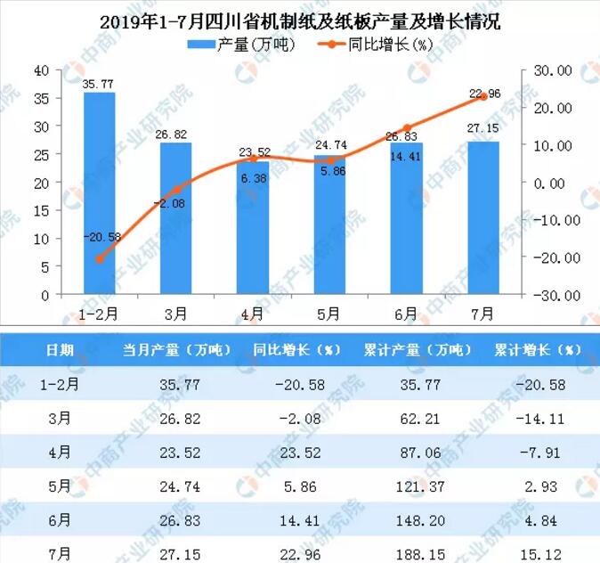 2019年1-2季度四川省機(jī)制紙及紙板產(chǎn)量有所增長(zhǎng),增長(zhǎng)19.97%。2019年7月四川省機(jī)制紙及紙板產(chǎn)量為27.15萬(wàn)噸,同比增長(zhǎng)22.96%。2019年1-7月四川省機(jī)制紙及紙板產(chǎn)量為188.15萬(wàn)噸,同比增長(zhǎng)15.12%。