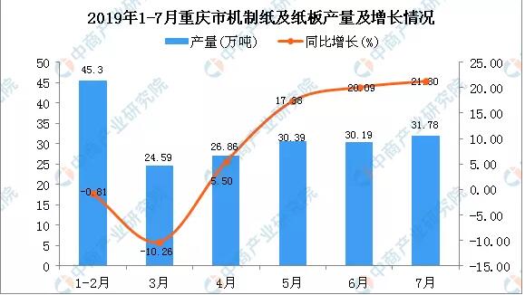 2019年1-2季度重慶市機(jī)制紙及紙板產(chǎn)量有所增長(zhǎng),2019年7月重慶市機(jī)制紙及紙板產(chǎn)量為31.78萬(wàn)噸,同比增長(zhǎng)21.3%。2019年1-7月重慶市機(jī)制紙及紙板產(chǎn)量為194.15萬(wàn)噸,同比增長(zhǎng)10.46%。