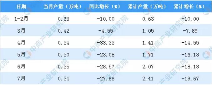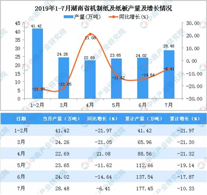 2019年1-2季度湖南省機(jī)制紙及紙板產(chǎn)量有所增長(zhǎng),2019年7月湖南省機(jī)制紙及紙板產(chǎn)量為28.48萬(wàn)噸,同比下降6.41%。2019年1-7月湖南省機(jī)制紙及紙板產(chǎn)量為177.45萬(wàn)噸,同比下降10.33%。