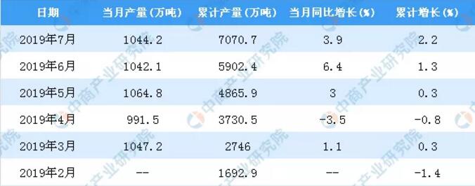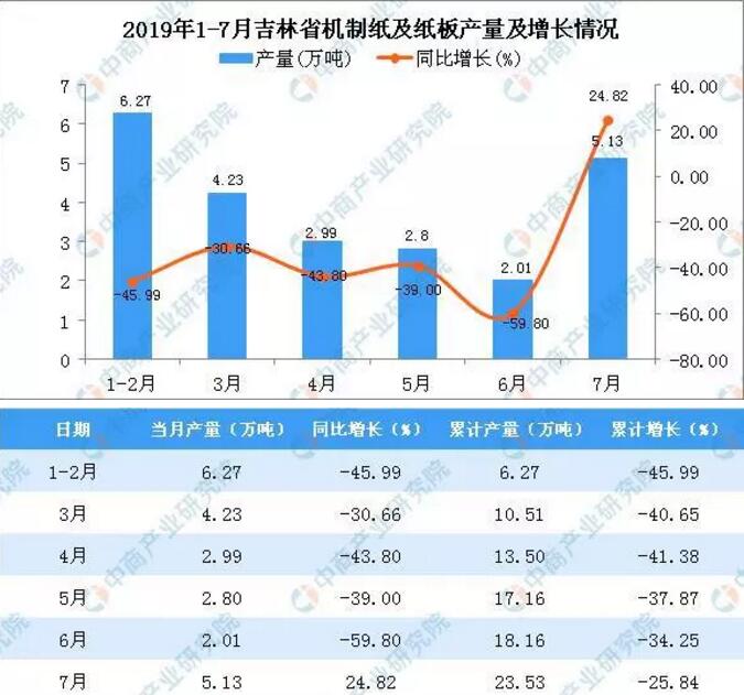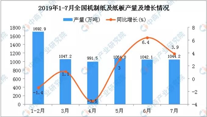 (▼2019年1-7月全國(guó)機(jī)制紙及紙板產(chǎn)量統(tǒng)計(jì)數(shù)據(jù))