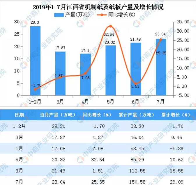 2019年1-2季度江西省機(jī)制紙及紙板產(chǎn)量有所增長(zhǎng),2019年7月江西省機(jī)制紙及紙板產(chǎn)量為23.04萬(wàn)噸,同比增長(zhǎng)25.35%。2019年1-7月江西省機(jī)制紙及紙板產(chǎn)量為150.58萬(wàn)噸,同比增長(zhǎng)29.09%。