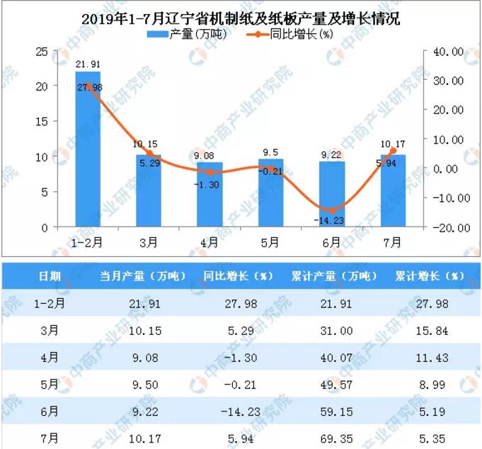 2019年1-2季度遼寧省機(jī)制紙及紙板產(chǎn)量有所下降,2019年7月遼寧省機(jī)制紙及紙板產(chǎn)量為10.17萬(wàn)噸,同比增長(zhǎng)5.94%。2019年1-7月遼寧省機(jī)制紙及紙板產(chǎn)量為69.35萬(wàn)噸,同比增長(zhǎng)5.35%。
