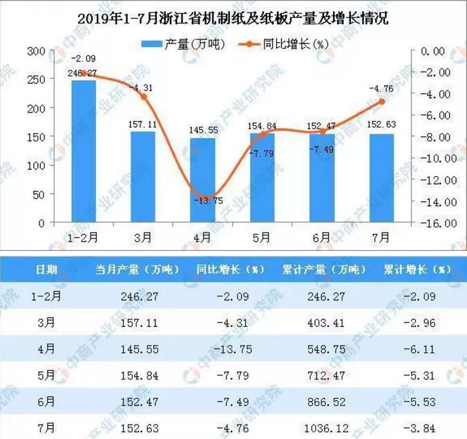 2019年1-2季度浙江省機(jī)制紙及紙板產(chǎn)量有所增長(zhǎng),2019年7月浙江省機(jī)制紙及紙板產(chǎn)量為152.63萬(wàn)噸,同比下降4.76%。2019年1-7月浙江省機(jī)制紙及紙板產(chǎn)量為1036.12萬(wàn)噸,同比下降3.84%。