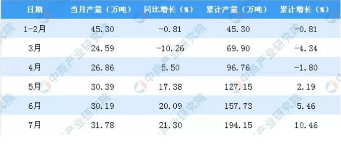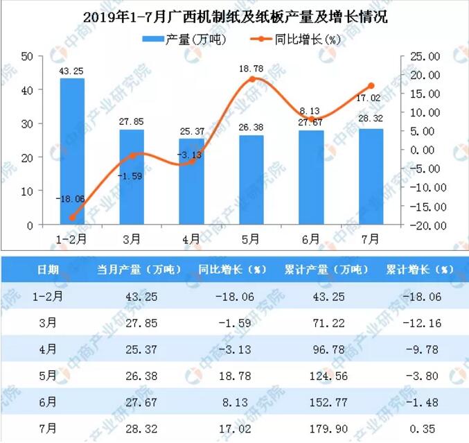 2019年1-2季度廣西機(jī)制紙及紙板產(chǎn)量有所增長(zhǎng),2019年7月廣西機(jī)制紙及紙板產(chǎn)量為28.32萬(wàn)噸,同比增長(zhǎng)17.02%。2019年1-7月廣西機(jī)制紙及紙板產(chǎn)量為179.9萬(wàn)噸,同比增長(zhǎng)0.35%。