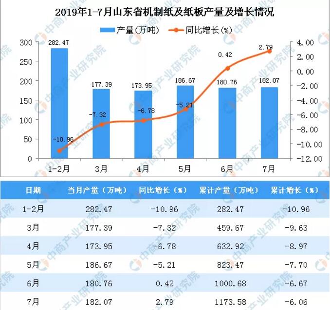2019年1-2季度山東省機(jī)制紙及紙板產(chǎn)量有所增長(zhǎng),2019年7月山東省機(jī)制紙及紙板產(chǎn)量為182.07萬(wàn)噸,同比增長(zhǎng)2.79%。2019年1-7月山東省機(jī)制紙及紙板產(chǎn)量為1173.58萬(wàn)噸,同比下降6.06%。