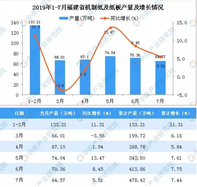 2019年1-2季度福建省機(jī)制紙及紙板產(chǎn)量有所增長(zhǎng),2019年7月福建省機(jī)制紙及紙板產(chǎn)量為64.57萬(wàn)噸,同比增長(zhǎng)5.51%。2019年1-7月福建省機(jī)制紙及紙板產(chǎn)量為478.42萬(wàn)噸,同比增長(zhǎng)7.44%。