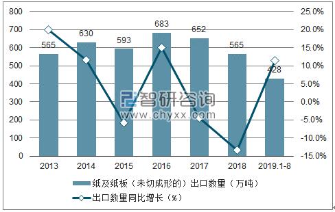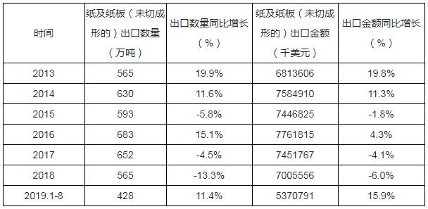 2013-2019年8月中國(guó)紙及紙板(未切成形的)出口數(shù)量及出口金額統(tǒng)計(jì)表