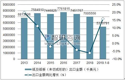 2013-2019年8月中國(guó)紙及紙板(未切成形的)出口金額趨勢(shì)圖