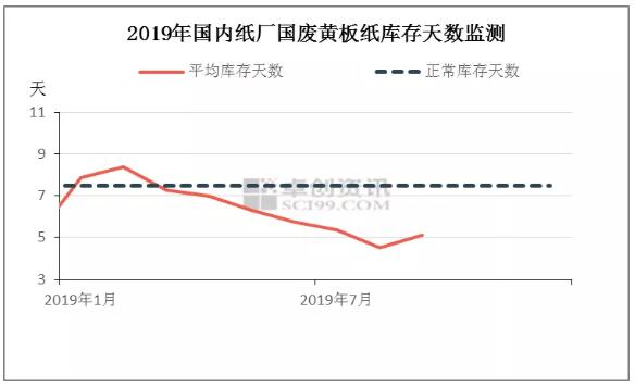 2019年紙廠廢舊黃板紙庫存天數為6.39天