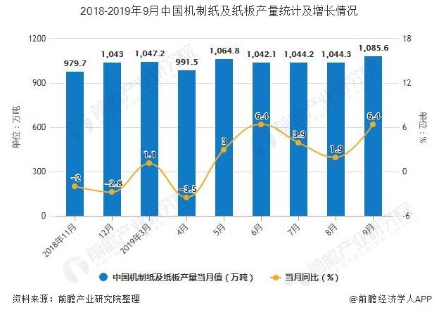 2019年前9月中國機制紙及紙板產量接近9300萬噸
