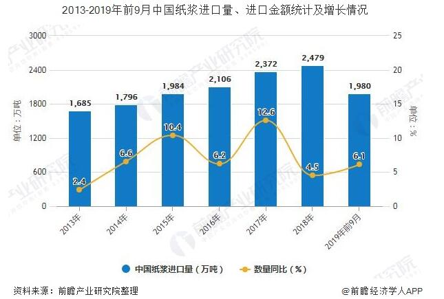 根據中國海關數據統計顯示,2019年1-3季度中國紙漿進口量逐漸增長,增長29.63%。2019年9月中國紙漿進口量為216.2萬噸,同比增長1.9%。累計方面,2019年1-9月中國紙漿進口量達到1980萬噸,同比增長6.1%。