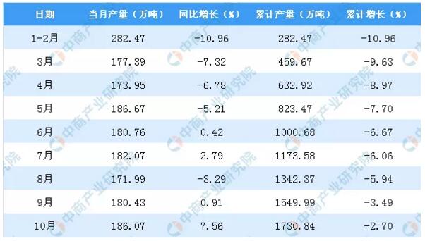 2019年1-3季度山東省機制紙及紙板產量波動幅度不大,2019年10月山東省機制紙及紙板產量為186.07萬噸,同比增長7.56%。2019年1-10月山東省機制紙及紙板產量為1730.84萬噸,同比下降2.7%。