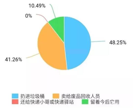 在143位問卷受訪者中,近半數表示會將紙箱直接扔進垃圾桶,只有15位表示會留作它用,會歸還快遞小哥或快遞驛站的則無一人。紙箱的直接二次利用率只有10.49%。