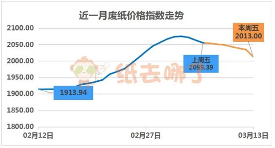 上周,廢紙價(jià)格“大跳水”,降價(jià)的范圍、幅度越來(lái)越大,甚至出現(xiàn)一日多次降價(jià)的情況。幾家大廠更是一馬當(dāng)先,領(lǐng)頭降價(jià)。截至3月13日(上周五)上午,廢紙價(jià)格指數(shù)為2013.00點(diǎn),相比前一周周五的2055.39點(diǎn),下跌42.39點(diǎn)。