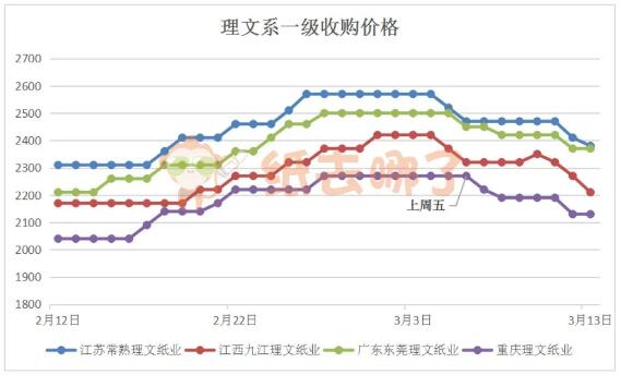 上周理文系一級(jí)紙收購(gòu)價(jià)格下跌,幾家理文均多次下調(diào)紙價(jià)。截至3月13日上午,江蘇、江西、廣東、重慶理文總體上分別下調(diào)90、110、80、140元/噸。理文系一級(jí)紙以江蘇理文最高,為2380元/噸;重慶理文最低,為2130元/噸。