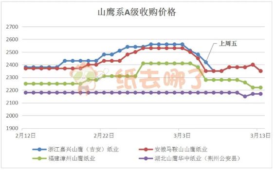 截至3月13日上午,浙江、福建、湖北山鷹總體分別下調(diào)70、60、10元/噸,安徽雖多次起伏,但最終持平在與前一周周五相同的2350元/噸。