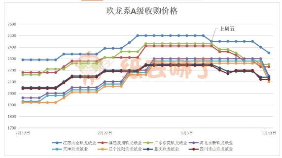 上周玖龍系紙廠停止觀望,A級(jí)紙收購(gòu)價(jià)格大幅下降。截至3月13日上午,江蘇玖龍下跌100元/噸,福建、廣東玖龍均下跌180元/噸,河北、天津玖龍均下跌150元/噸,沈陽(yáng)、重慶、四川分別下跌160、110、120元/噸。玖龍系A(chǔ)級(jí)以江蘇玖龍最高,為2350元/噸;遼寧玖龍最低,為2100元/噸。