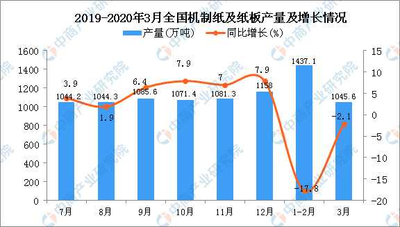 據中商產業研究院數據庫顯示,2020年1季度全國機制紙及紙板產量有所下降,2020年3月全國機制紙及紙板產量為1045.6萬噸,同比下降2.1%。2020年1季度全國機制紙及紙板產量為2459.7萬噸,同比下降12.4%。