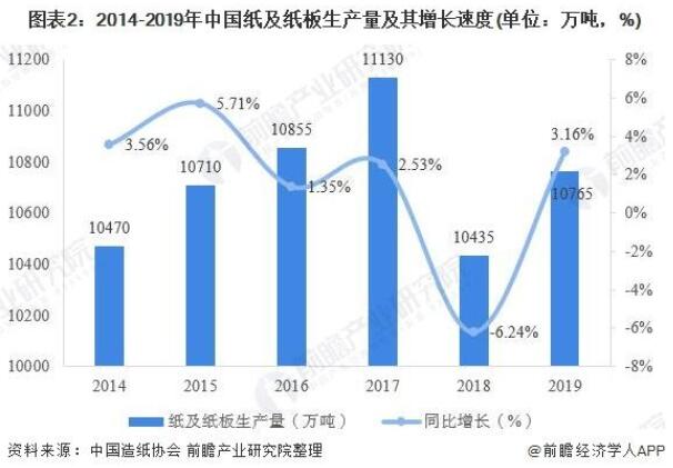 據中國造紙協會統計數據顯示,2014年以來,我國紙及紙板產量整體呈現震蕩上行趨勢,增速保持在低位運行。2017年,我國紙及紙板生產量首次突破11000萬噸,創歷史新高;2018年,受行業景氣度下滑影響,整體產量小幅下滑,到2019年,我國紙及紙板生產量有所回升,累計產量為10765萬噸,同比增長3.16%。