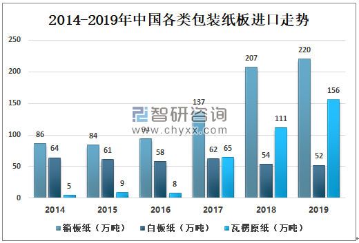 由于受到環保持續趨嚴、原料供給受限等因素影響,箱紙板和瓦楞原紙進口量大幅增長,使國內箱紙板和瓦楞原紙市場競爭更加激烈。隨著我國包裝紙板企業海外項目建成投產,進口包裝紙板的總量將繼續增長。2019年箱板紙進口數量為220萬噸;白板紙進口數量為52萬噸,瓦楞原紙進口數量為156萬噸。
