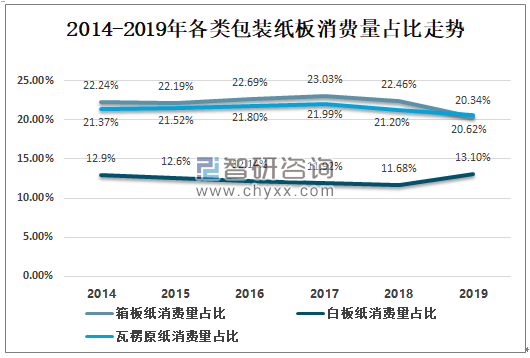 2019年箱紙板消費量占比為20.34%;白紙板消費量占比為13.1%;瓦楞原紙消費量占比為20.62%。