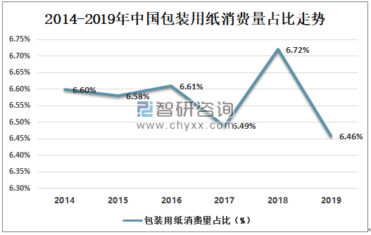 包裝紙板早已成為造紙行業中最重要的紙種之一,其需求占據著造紙行業總體需求的近60%。隨著包裝行業的多元發展,包裝紙板產品在人民生活中的作用越來越明顯,對包裝紙板的依賴性也越來越強。包裝紙板行業的發展又面臨著必須不斷適應更高的環保標準、解決原料短缺及中美貿易戰的不確定性等多項挑戰。包裝用紙消費量走勢占比維持在6.5%。