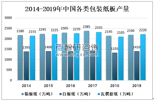 2019年中國包裝紙板產量為5800萬噸左右,其中箱紙板產量為2190萬噸,白紙板產量為1410萬噸,瓦楞紙產量為2220萬噸。
