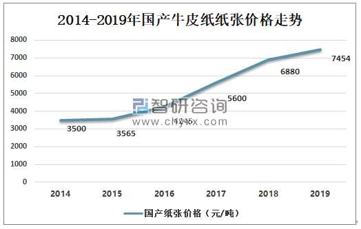 數據顯示:牛皮紙紙張價格逐年上漲,2014-2019年國產牛皮紙價格平均增速為16.8%。