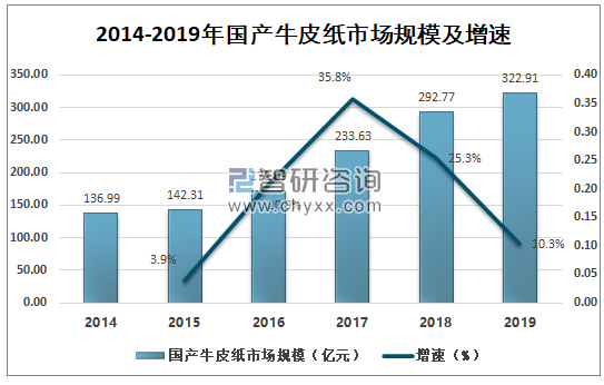 牛皮紙為環保包裝紙,是因為牛皮紙可以回收再利用,部分牛皮紙是采用廢紙漿制造屬于再生環保牛皮紙。2019年中國牛皮紙市場規模約為322.91億元,同比增加10.3%。