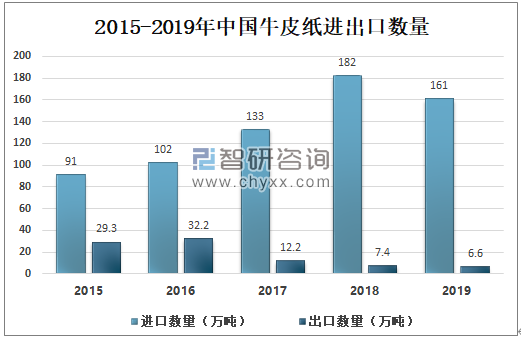 現在很多包裝材料都是使用牛皮紙,牛皮紙成為了商業包裝的必需品。我國進口牛皮紙數量遠大于出口,2019年中國牛皮紙進口數量為161萬噸,出口數量僅6.6萬噸。