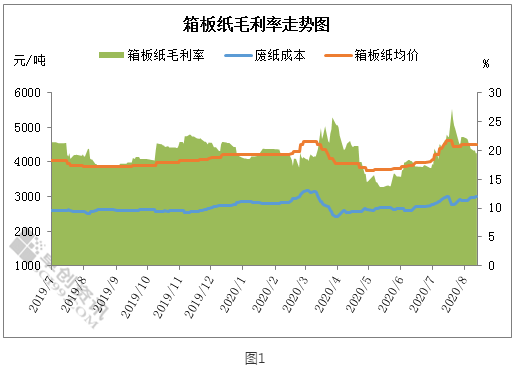 近一段時間以來,國內箱板紙與廢舊黃板紙價格走勢呈現出一定的背離走勢。根據卓創資訊統計的國內箱板紙均價與廢舊黃板紙均價看,箱板紙價格弱勢下滑,而廢舊黃板紙價格則呈上漲格局。卓創資訊監測的箱板紙毛利率數據顯示,箱板紙毛利率已連續三周下行,紙企利潤空間在不斷被壓縮。