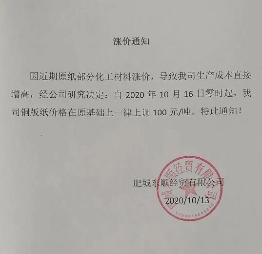 肥城東順:自10月16日起,我司銅版紙價格在原基礎上一律上調100元/噸。