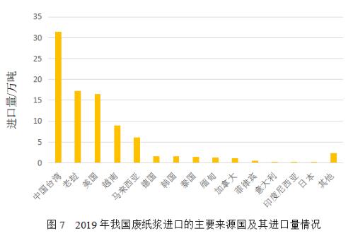 我國進口的廢紙漿主要來自中國臺灣、老撾、美國、越南、馬來西亞5個國家及地區(qū),從這個5個國家及地區(qū)的廢紙漿進口量達80.3萬噸,占我國總廢紙漿進口量的88%(見圖7)。