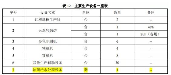 項(xiàng)目將購置2條瓦楞紙板生產(chǎn)線、6臺多色印刷機(jī)、4臺粘箱機(jī)、8臺釘箱機(jī)、2臺天然氣鍋爐、1套油墨污水處理設(shè)備以及30臺配套生產(chǎn)輔助設(shè)備。