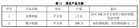 項(xiàng)目建成投產(chǎn)后,可年產(chǎn)1.2億平方米瓦楞紙板(其中500萬平方米用于制作紙箱,其余外售)、500萬平方米數(shù)字紙箱(油性墨與水性墨紙箱比例為2:3)。