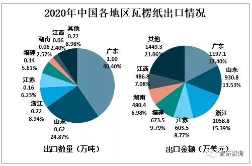 2020年廣東省瓦楞紙出口數量為1.0萬噸,占全國總出口數量的40.40%;出口金額為1197.1萬美元,占全國總出口金額的17.40%。2020年山東瓦楞紙出口數量為0.62萬噸,占全國總出口數量的24.87%;出口金額為930.8萬美元,占全國總出口金額的13.53%。
