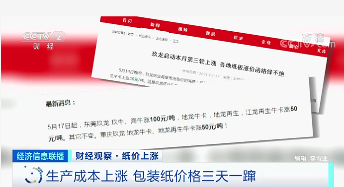 全國工商聯紙業商會秘書長張慎金:主要原因是造紙上游的紙漿、物流、能源等價格全球性的上漲,直接增加了企業的生產成本。第二個這次上漲是在之前較低的基礎上上漲的,尤其是白卡紙,現在上漲幅度比較大。