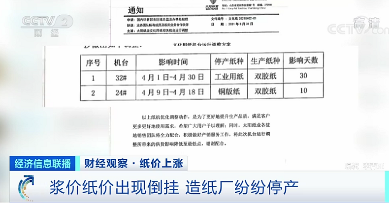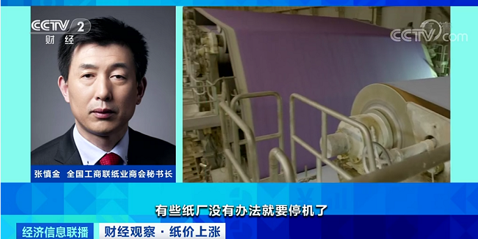 全國工商聯紙業商會秘書長張慎金:停機的原因是受紙漿原料價格上漲,造成漿價和紙價的倒掛,這樣有些紙廠沒有辦法就要停機了。