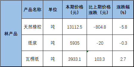 其中林產品領域,5月中旬與5月上旬相比,紙漿價格下跌20元,跌幅0.3%;瓦楞紙價格上漲103.3元,漲幅2.7%。